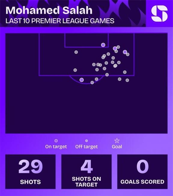 بحسب موقع Squawka، المتخصص في تسجيل وتحليل البيانات، فإن صلاح خلال آخر 10 مباريات له في البريميرليج، لمس الكرة 80 لمسة داخل منطقة جزاء الخصم، سدد 29 تسديدة، 4 تسديدات فقط بين القائمين والعارضة.