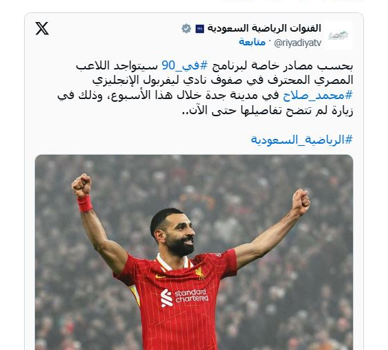 وقالت القنوات الرياضية السعودية في حسابها على منصة "إكس": "بحسب مصادر خاصة لبرنامج في_90 سيتواجد اللاعب المصري المحترف في صفوف نادي ليفربول الإنجليزي محمد صلاح في مدينة جدة خلال هذا الأسبوع، وذلك في زيارة لم تتضح تفاصيلها حتى الآن".