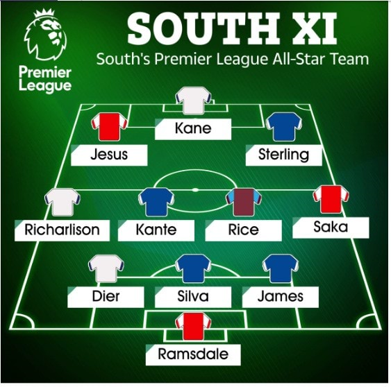 فيما قد يضم فريق الجنوب نجوما مثل هاري كين ورحيم سترلينغ وغابرييل خيسوس وساكا وريشارلسون وتياغو سيلفا وديكلان رايس والحارس رامسدال.