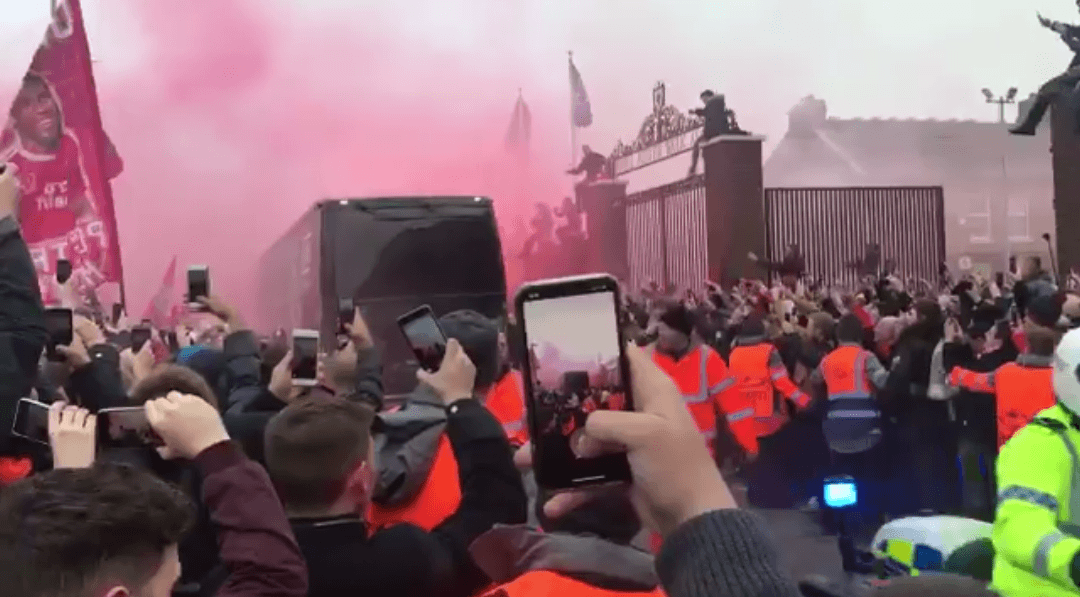 قامت جماهير فريق #ليفربول باعتراض حافلة ضيفه #مانشستر_سيتي ، أثناء وصولها إلى ملعب "الانفيلد" ، الذي يحتضن لقاء الفريقين في ذهاب ربع نهائي دوري أبطال أوروبا لكرة القدم ، اليوم الأربعاء.