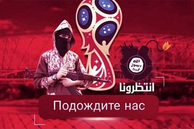 حيث يُظهر الملصق جهاديًا وسط انفجار ويحمل سلاح AK-47، في ساحة كرة قدم مكتظة في الخلفية، بينما يمكن رؤية بوتين على يسار الصورة مع هدف أسود وبرتقالي يستهدفه مباشرة، وكُتب وسط الملصق "روسيا 2018، بوتين أنت كافر، سوف تدفع ثمن قتل المسلمين".