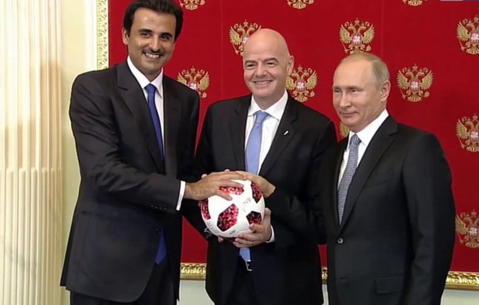تسلّم الشيخ #تميم_بن_حمد رئيس دولة قطر ، "راية" استضافة بطولة كأس العالم 2022 من الرئيس الروسي فلاديمير بوتين في قصر الكرملين بحضور #جاني_انفانتينو رئيس الاتحاد الدولي لكرة القدم "فيفا" ، وذلك في اليوم الختامي لمونديال 2018.