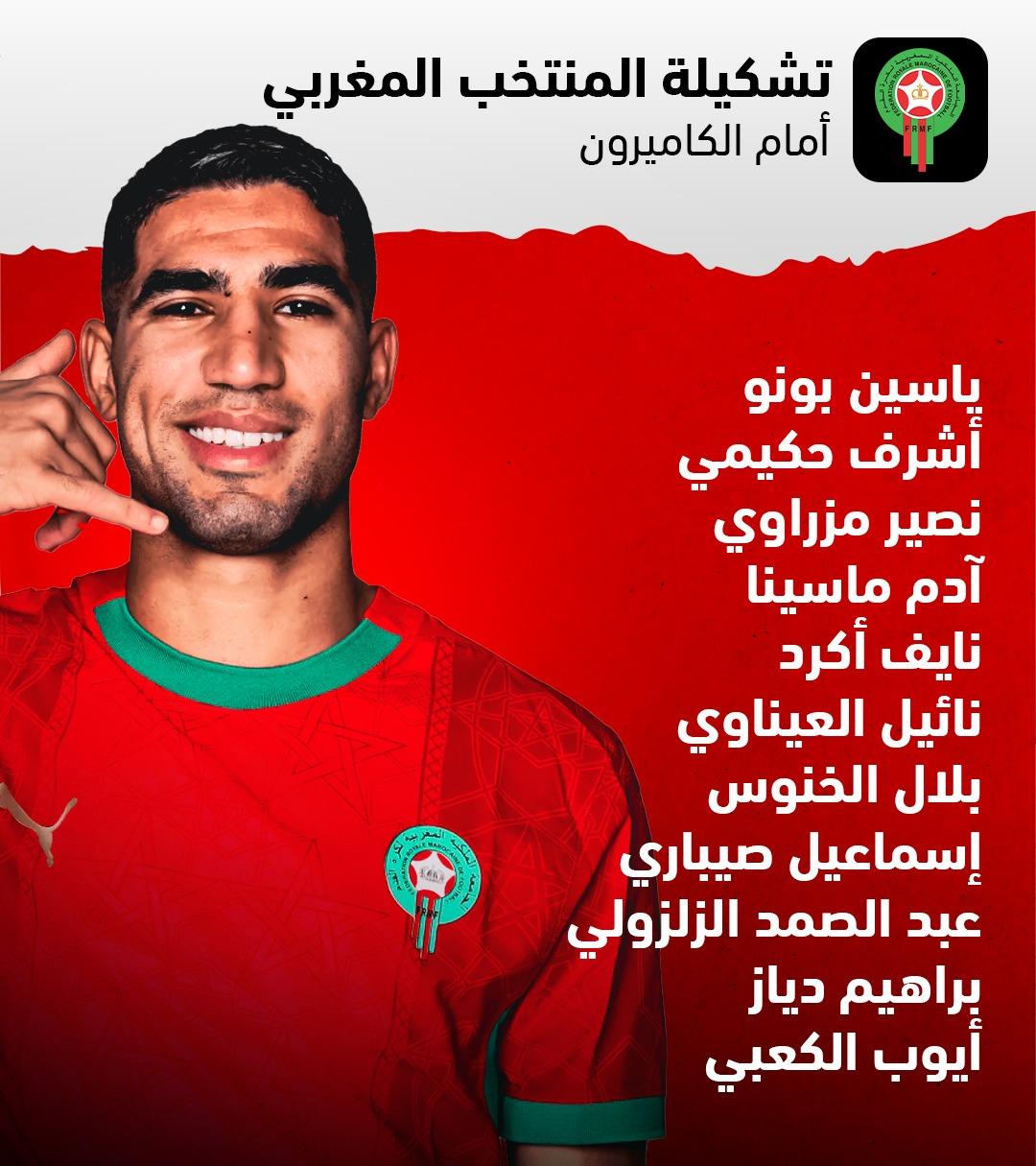 وسيدخل المنتخب المغربي المباراة بالأسماء التالية: ياسين بونو-نصير مزراوي-نايف أكرد-آدم ماسينا-أشرف حكيمي-نايل العيناوي-بلال الخنوس-براهيم دياز-اسماعيل الصيباري-عبد الصمد الزلزولي-أيوب الكعبي.