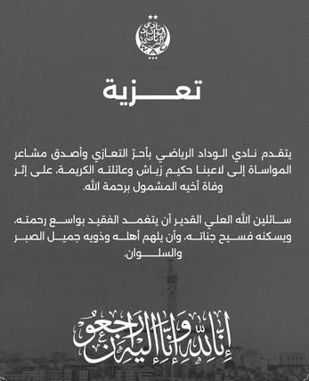 ملاعب - اعلن نادي الوداد البيضاوي المغربي وفاة شقيق لاعبه حكيم زياش، وقال النادي في بيان:" يتقدم نادي الوداد الرياضي بأحر التعازي وأصدق مشاعر المواساة إلى لاعبنا حكيم زياش وعائلته الكريمة، على إثر وفاة أخيه المشمول برحمة الله، نسأل الله العلي القدير أن يتغمد الفقيد بواسع رحمته ويسكنه فسيح جناته وأن يلهم أهله وذويه جميل الصبر والسلوان".