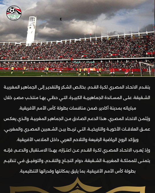 وقال اتحاد الكرة المصري بعد المباراة في بيان عبر حسابه على منصة "إكس"، إنه يتقدم بخالص الشكر والتقدير إلى الجماهير المغربية الشقيقة، على المساندة الجماهيرية الكبيرة، التي حظي بها منتخب مصر، خلال مبارياته بمدينة أكادير، ضمن منافسات بطولة كأس الأمم الإفريقية.
