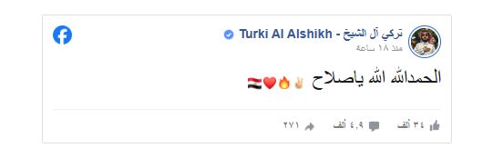 وعقب تسجيل صلاح ثالث أهداف منتخب مصر، كتب آل الشيخ عبر حسابه في موقع "فيسبوك": "الحمد الله الله يا صلاح".