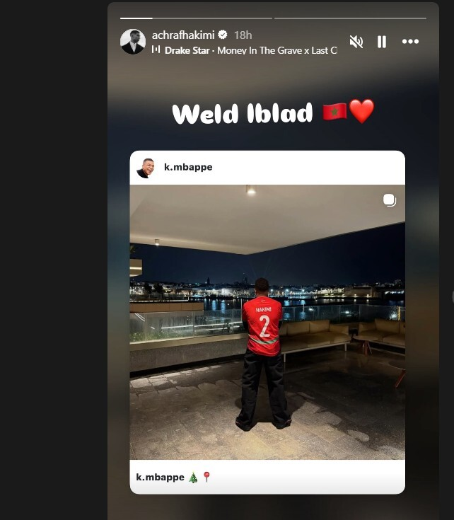 وبعد انتهاء اللقاء بالتعادل 1–1، نشر مبابي عبر خاصية "القصص" على حسابه في "إنستغرام" صورة له وهو يرتدي قميص المنتخب المغربي، وعلى ظهره الرقم 2، رقم قميص حكيمي مع "أسود الأطلس".