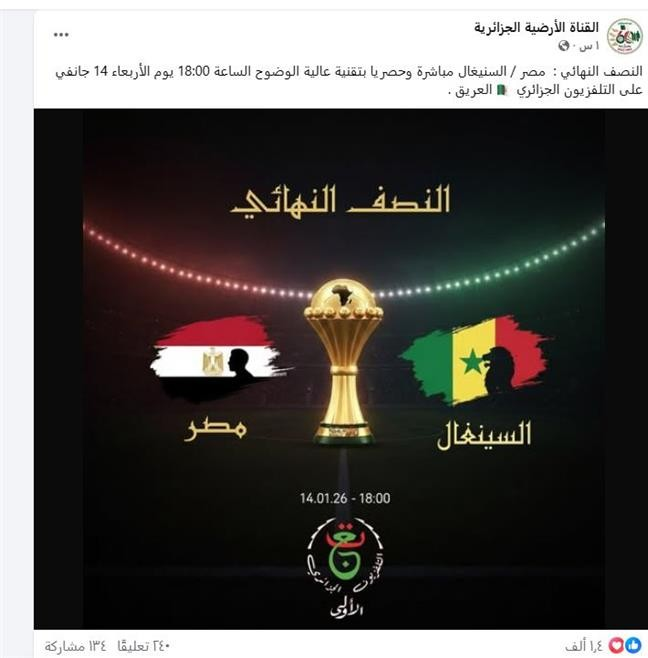ونشرت الصفحة الرسمية لقناة الأرضية الجزائرية على "فيس بوك": "النصف النهائي : مصر- السنغال مباشرة وحصريا بتقنية عالية الوضوح يوم الأربعاء 14 يناير على التلفزيون الجزائري".