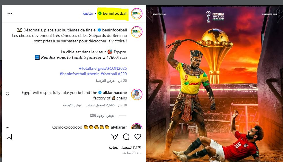ملاعب - نشر منتخب بنين، على موقع التواصل الاجتماعي انستغرام صورة مستفـ.زة ومهينة في تقديمها لمباراة المنتخبين في بطولة كأس الأمم الإفريقية 2026، المقرر إقامتها في السابعة مساء اليوم الاثننين.