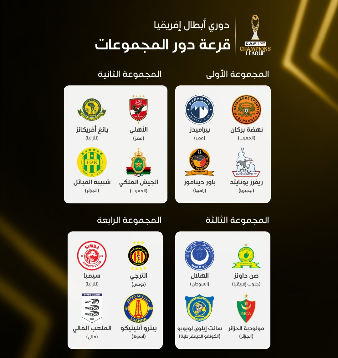 وسيلعب بيراميدز المصري بطل أفريقيا الموسم الماضي في المجموعة الأولى مع أندية نهضة بركان المغربي وصيف "الكونفدرالية"، بالإضافة إلى ريفرز يونايتد وباور ديناموس.