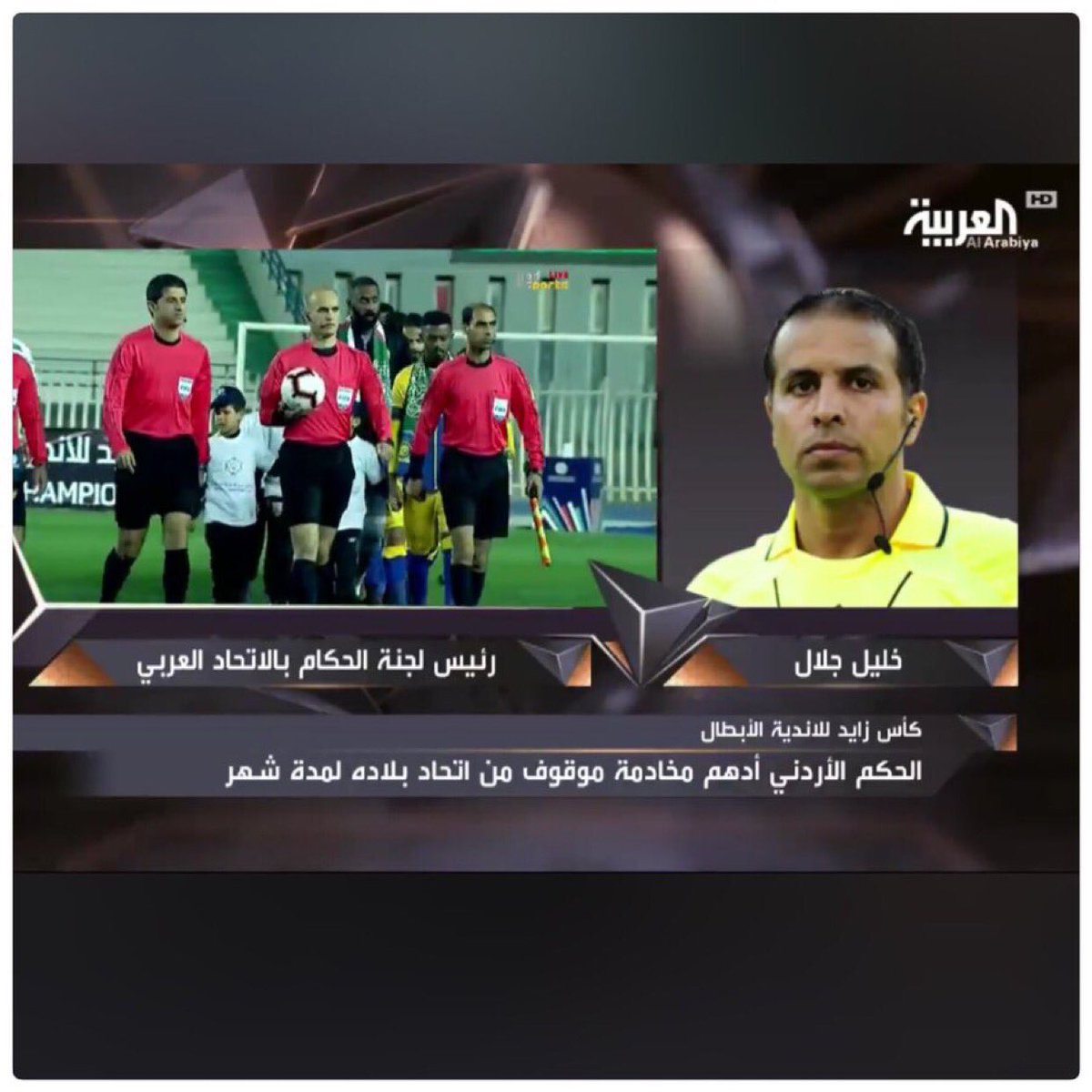 أكد رئيس لجنة الحكام في #الاتحاد_العربي لكرة القدم، خليل #جلال في حوارٍ مع قناة العربية، رداً على استفسارات تعيين أدهم #مخادمة ، لمواجهة #مولودية_الجزائر و #النصر السعودي ضمن دور الـ16 من كأس زايد للأندية الأبطال، أمس رغم أنه موقوف في بلده.