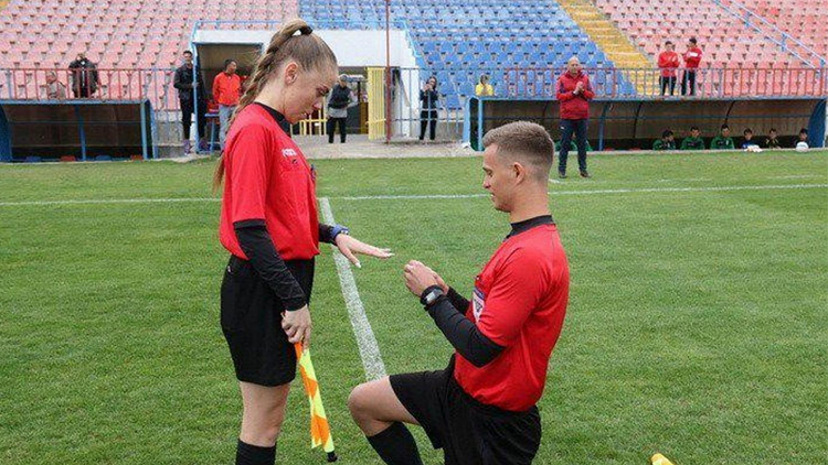 شهدت إحدى مباريات #الدوري_الروماني للدرجة الرابعة بكرة القدم، لقطة طريفة عندما قام الحكم المساعد بطلب يد زميلته في #التحكيم للزواج، أمام اللاعبين والجمهور.