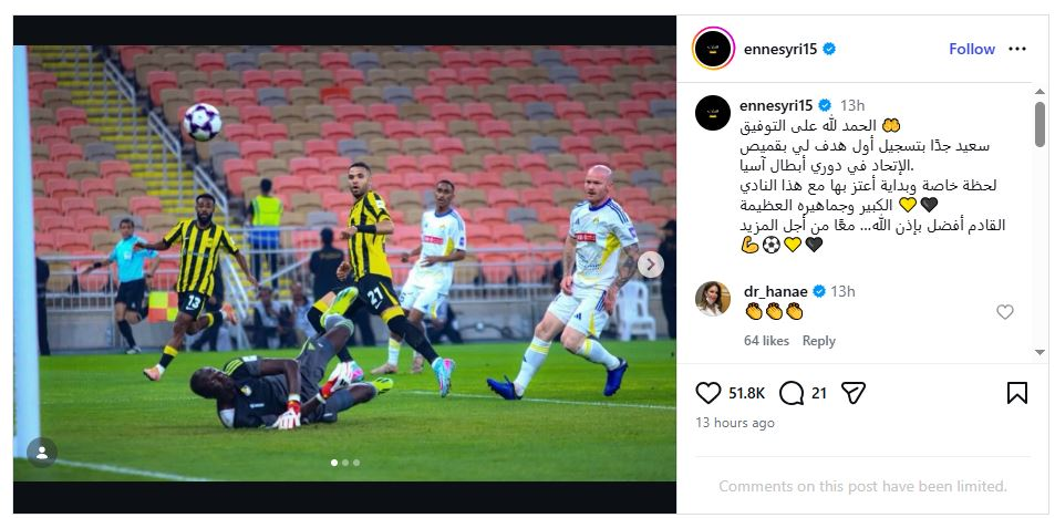ملاعب - علق الدولي المغربي يوسف النصيري على أول أهدافه مع اتحاد جدة السعودي، والذي جاء في شباك الغرافة القطري في الجولة السابعة من مرحلة الدوري لبطولة دوري أبطال آسيا للنخبة (مجموعة الغرب) لهذا الموسم.