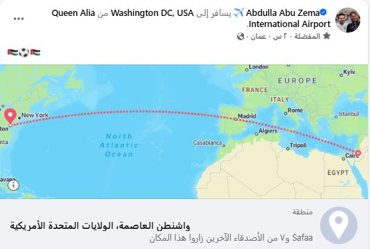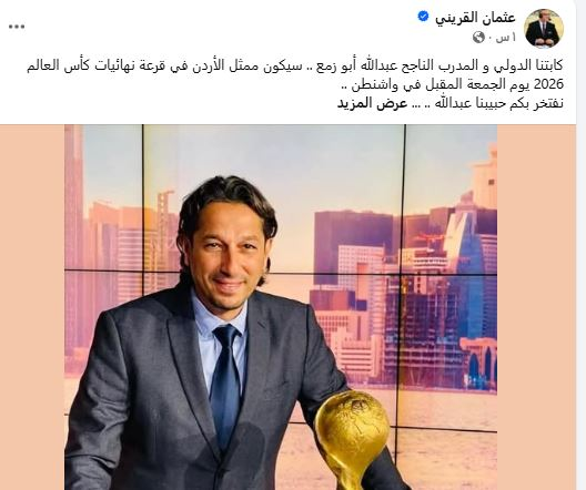 ملاعب - نشر المعلق الرياضي المخضرم عثمان القريني عبر صفحته الرسمية على موقع التواصل الاجتماعي فيسبوك عن سفر المدرب الوطني وقائد منتخب النشامى السابق الكابتن عبدالله ابو زمع للعاصمة الامريكية واشنطن لحضور قرعة نهائيات كأس العالم 2026.