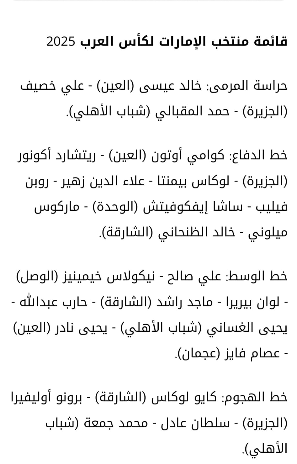 اعلن المدرب الروماني كوزمين المدير الفني لمنتخب الإمارات العربية المتحدة لكرة القدم قائمة لاعبيه الذين سيشاركون في بطولة كأس العرب والتي ستقام مبارياتها الرسمية اعتبارا من مطلع شهر كانون الاول ديسمبر المقبل في دولة قطر٠