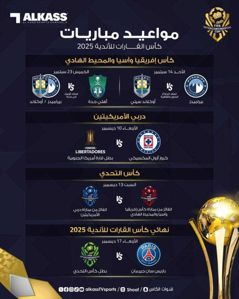 وتنطلق المواجهات يوم الأربعاء 10 ديسمبر (كانون الأول) 2025 بـ"ديربي الأمريكتين" بين كروز أزول المكسيكي وأبطال كأس كونميبول ليبرتادوريس، تليها مباراة "كأس التحدي" يوم السبت 13 ديسمبر (كانون الأول) بين الفائز من "الديربي" وبيراميدز المصري، على أن يُقام نهائي "كأس القارات للأندية" يوم الأربعاء 17 ديسمبر (كانون الأول) بين باريس سان جيرمان الفرنسي والفائز بكأس التحدي.
