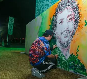من جانبه قال الرسام محمد خضر أن “منطقة البيت السعودي وفرت له مساحة واسعة لرسم اللوحة الجدارية التي اختار أن تحمل صورة اللاعب الدولي ياسر الشهراني”.